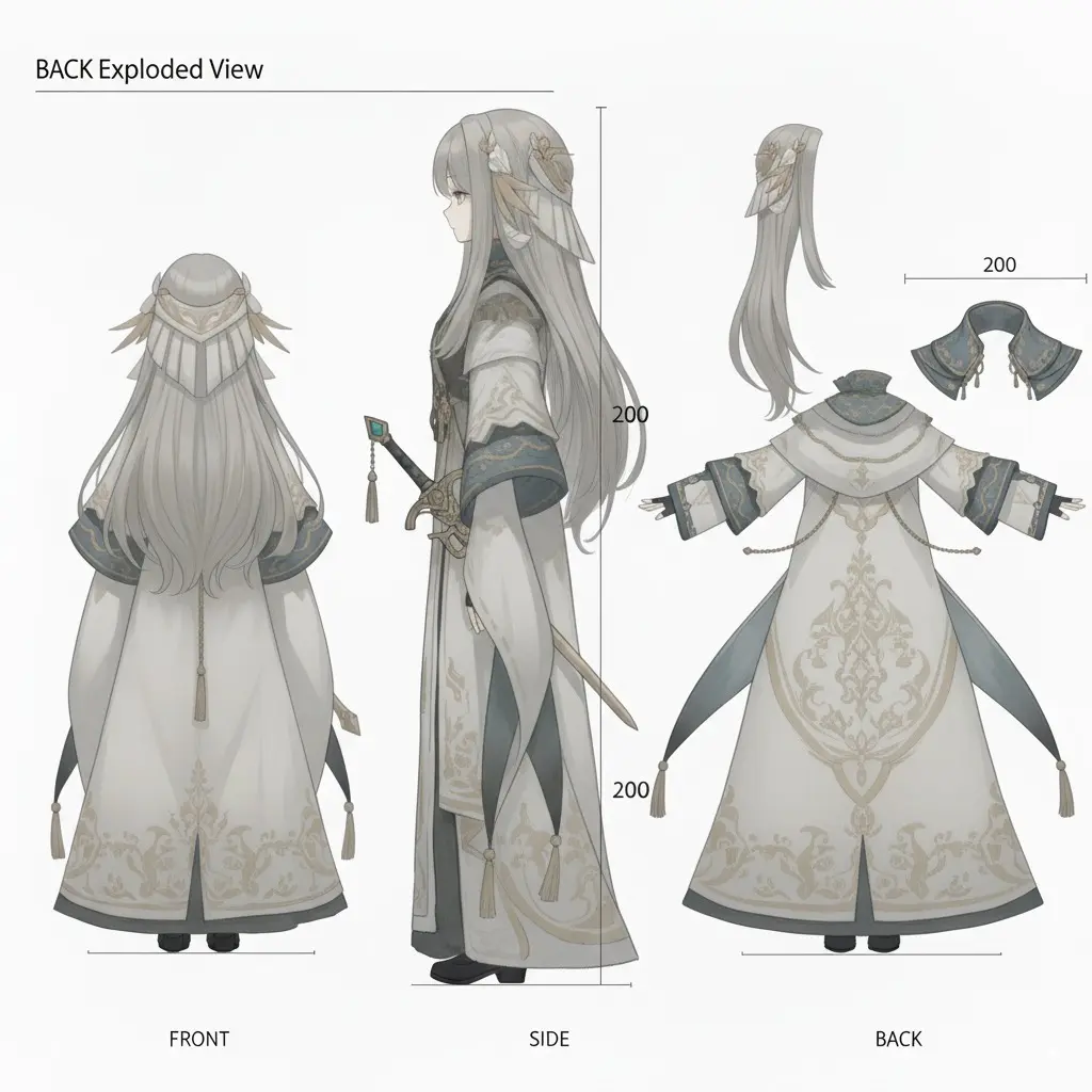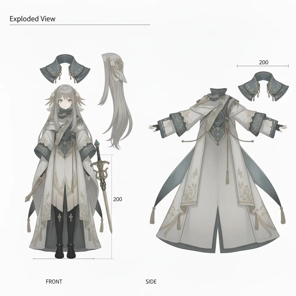 金と青のレースがあしらわれた白いポンチョを着て、首元に大きな青いチョーカーを巻いている。