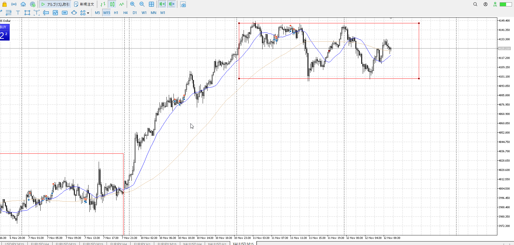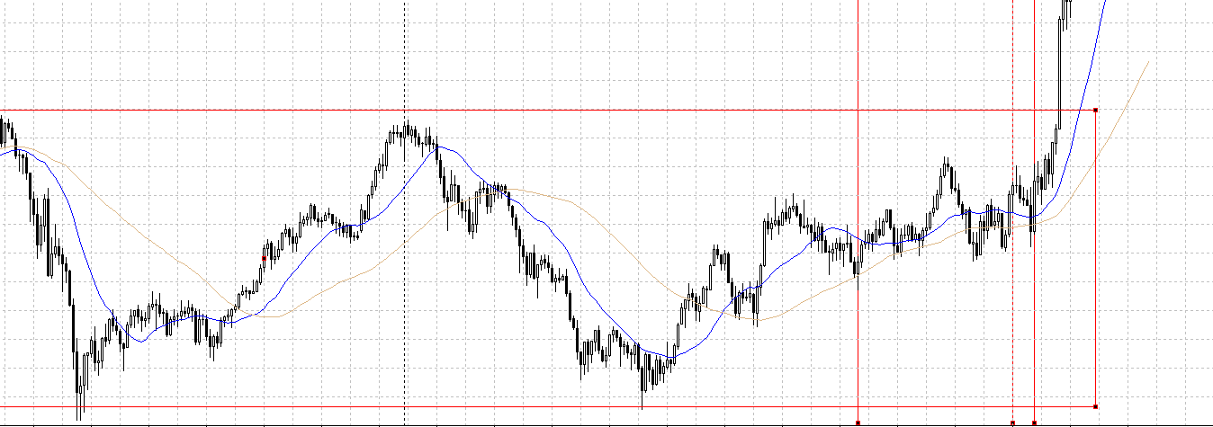 1つ目、全体買いで落ちてきて、振りを出してから落ち包みで戻る