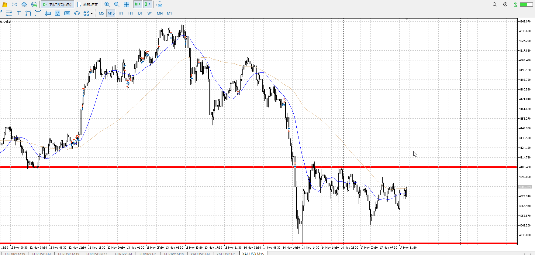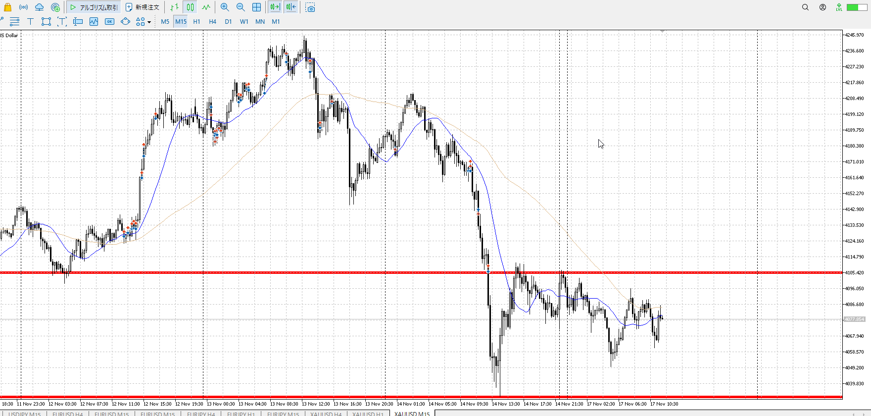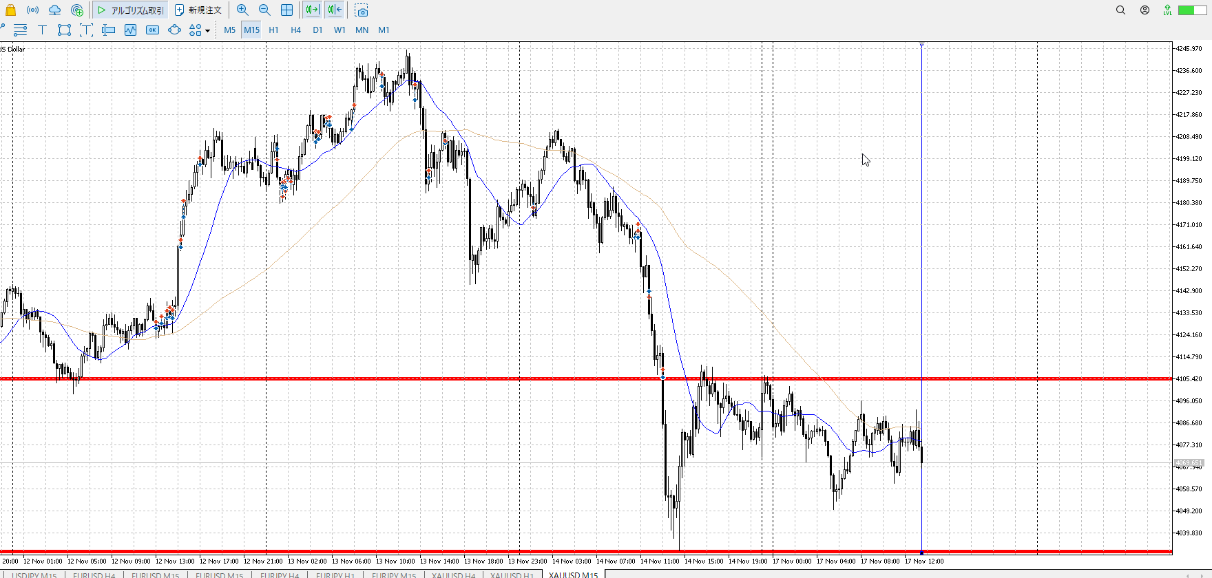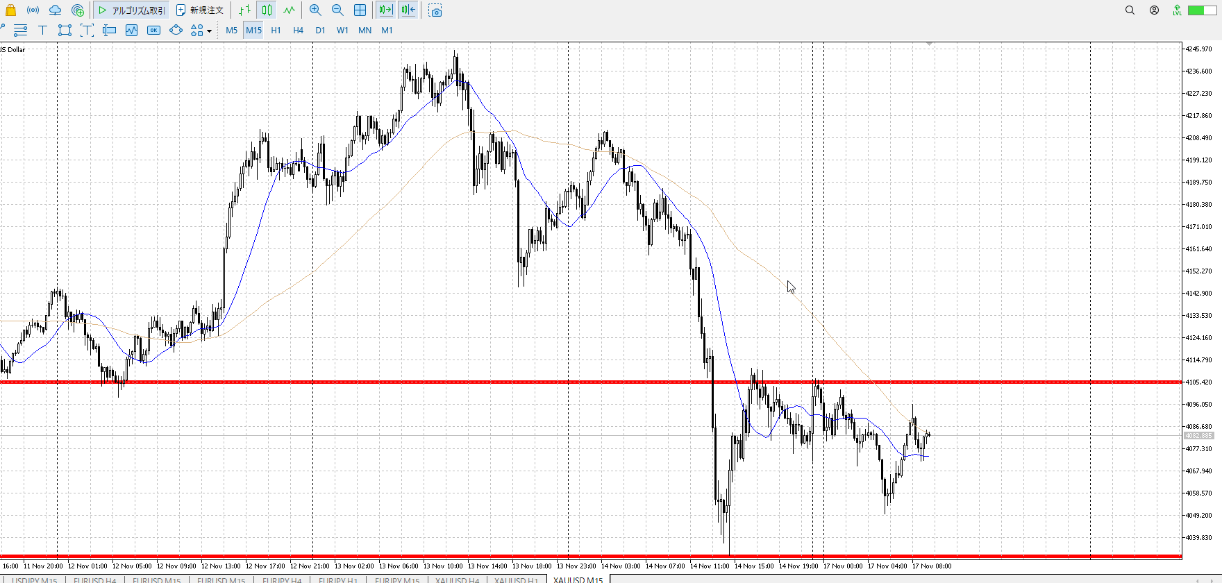 15mでレンジを作り下抜け。戻りが激しく一直線抜き。すると押しを買いたくなって。