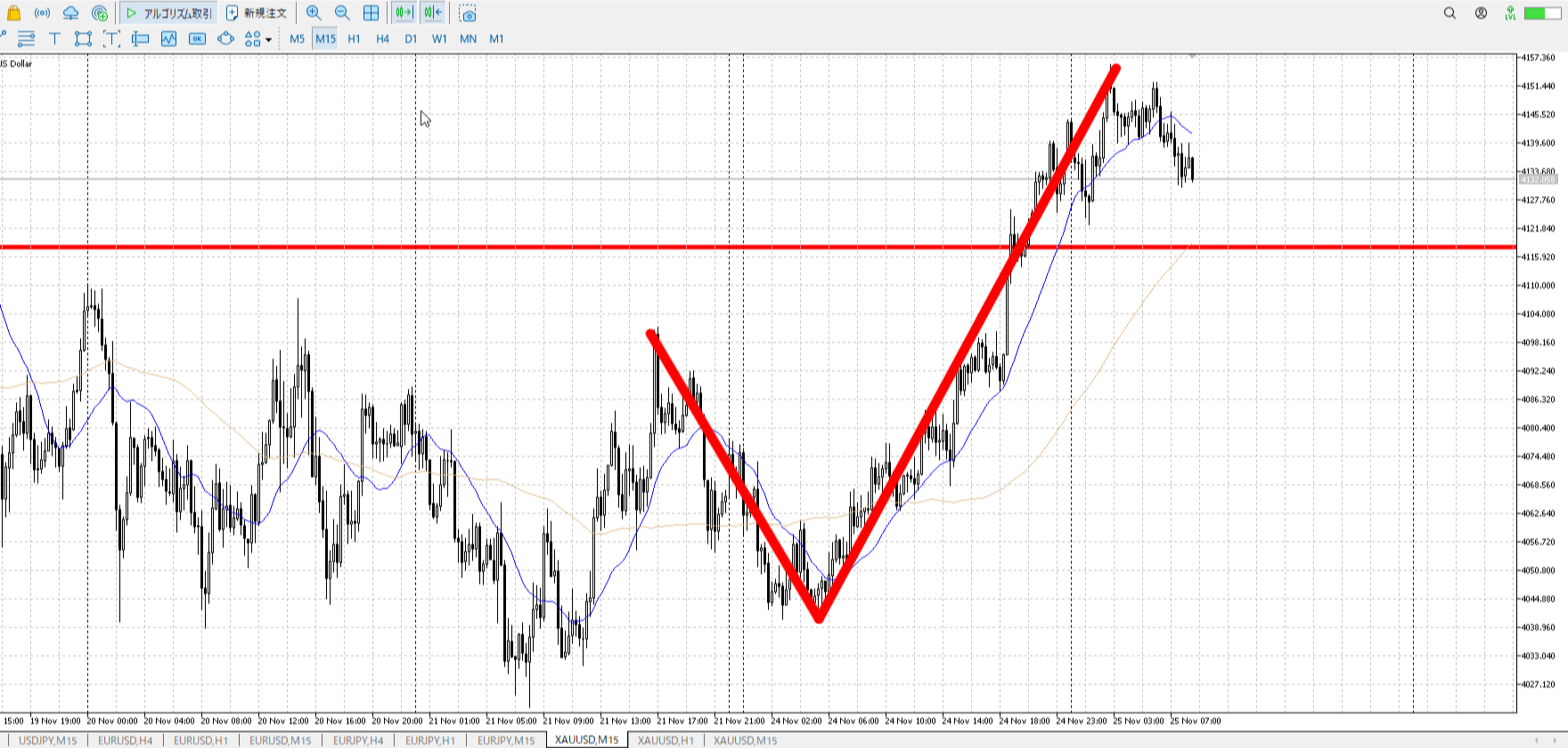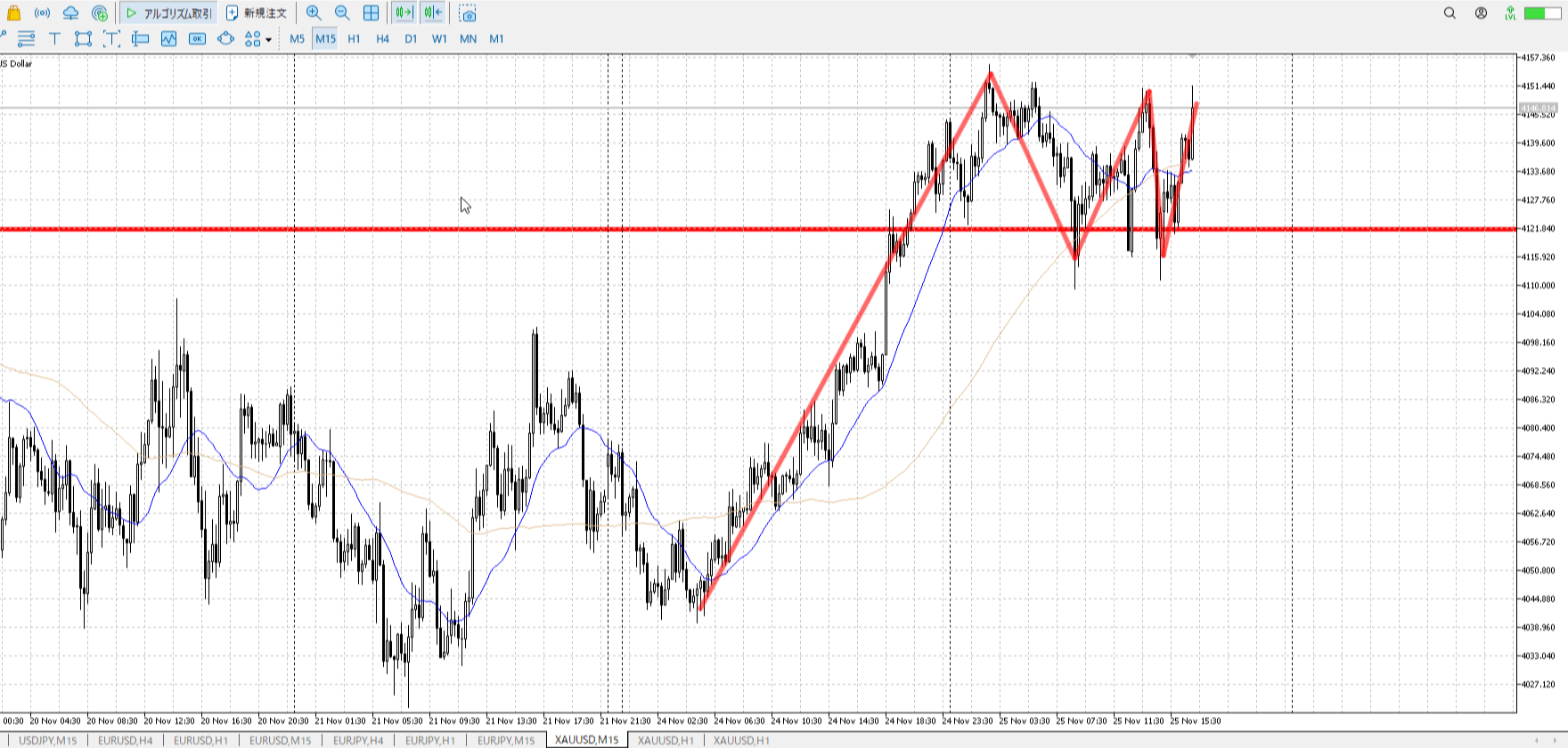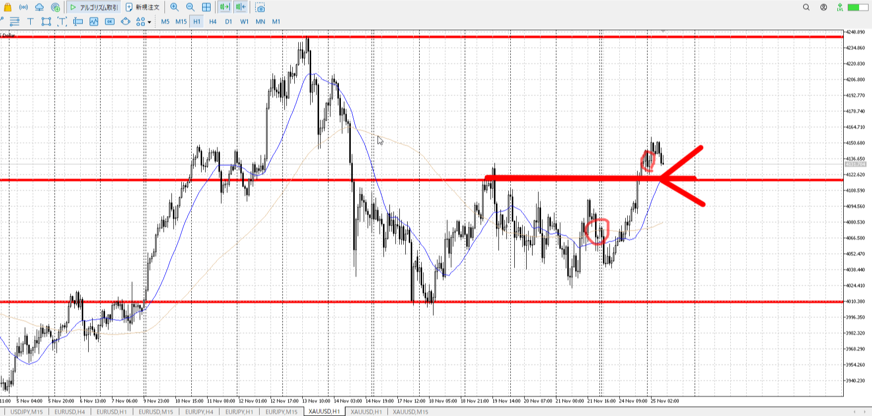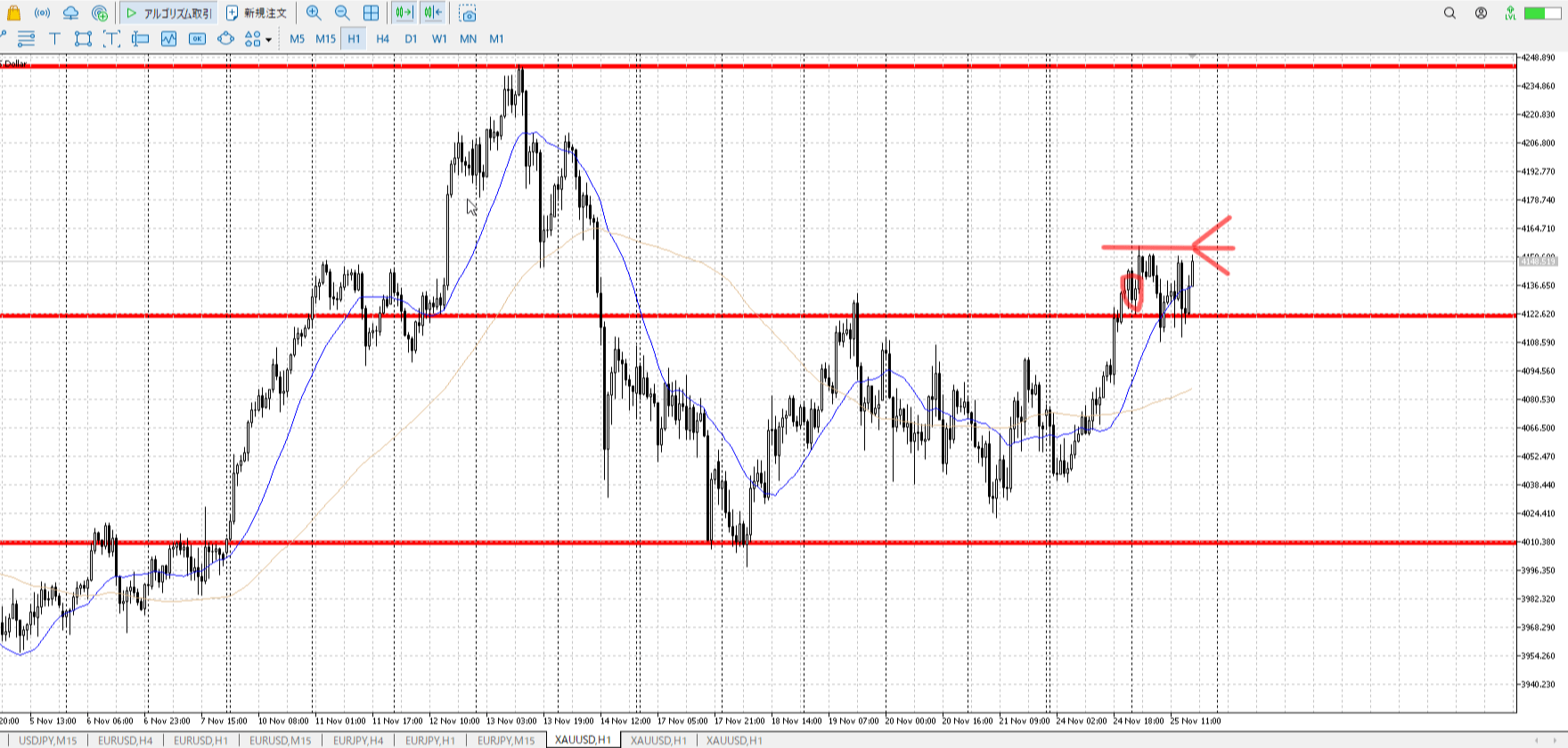 相場は買い。シナリオは上抜きか下からか買い。1hも下がりそうで、それからなら買い場に触れた時のPAで1hで買える。つまり上抜き期待。