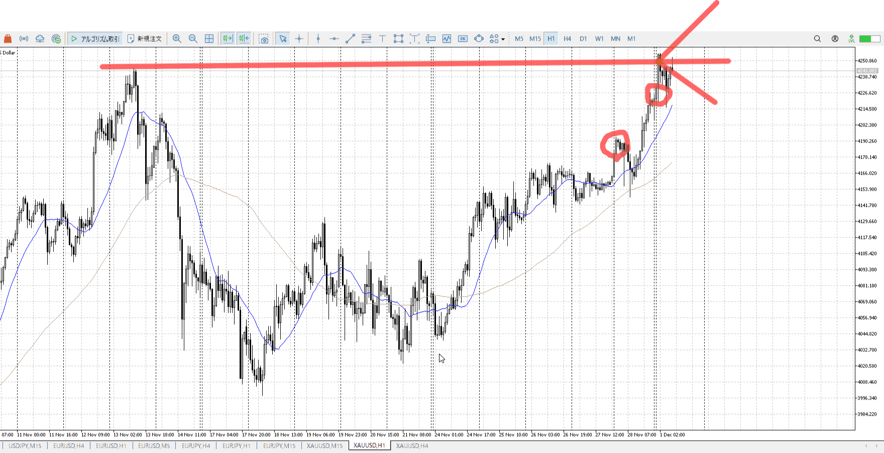 これを抜くと4h上トレンドなので抜きたいが、力が無い。1hの調整を入れてから一気にやりたい。