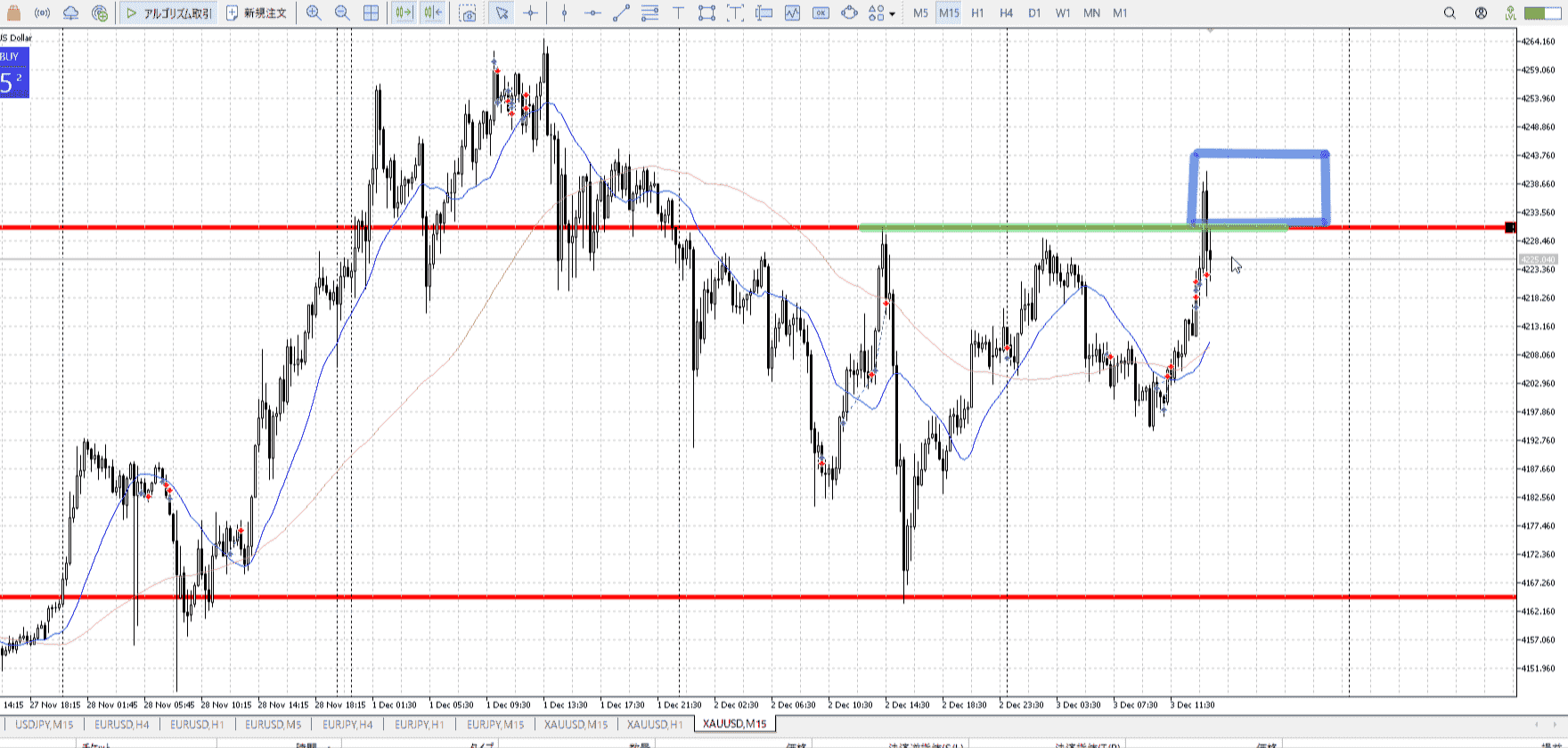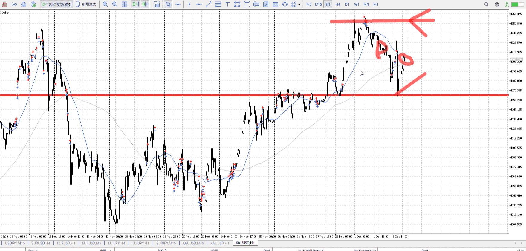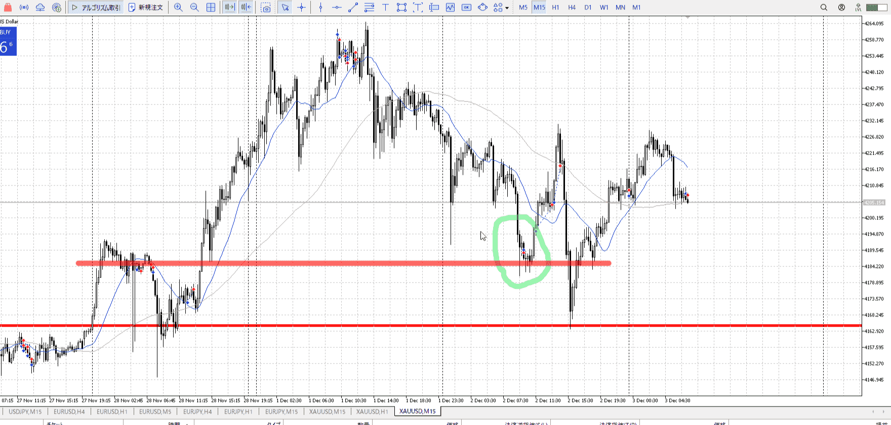 緑丸地点を参照して買ったが、明らかに1h買い場の影響を受けているこことは状況が違う。