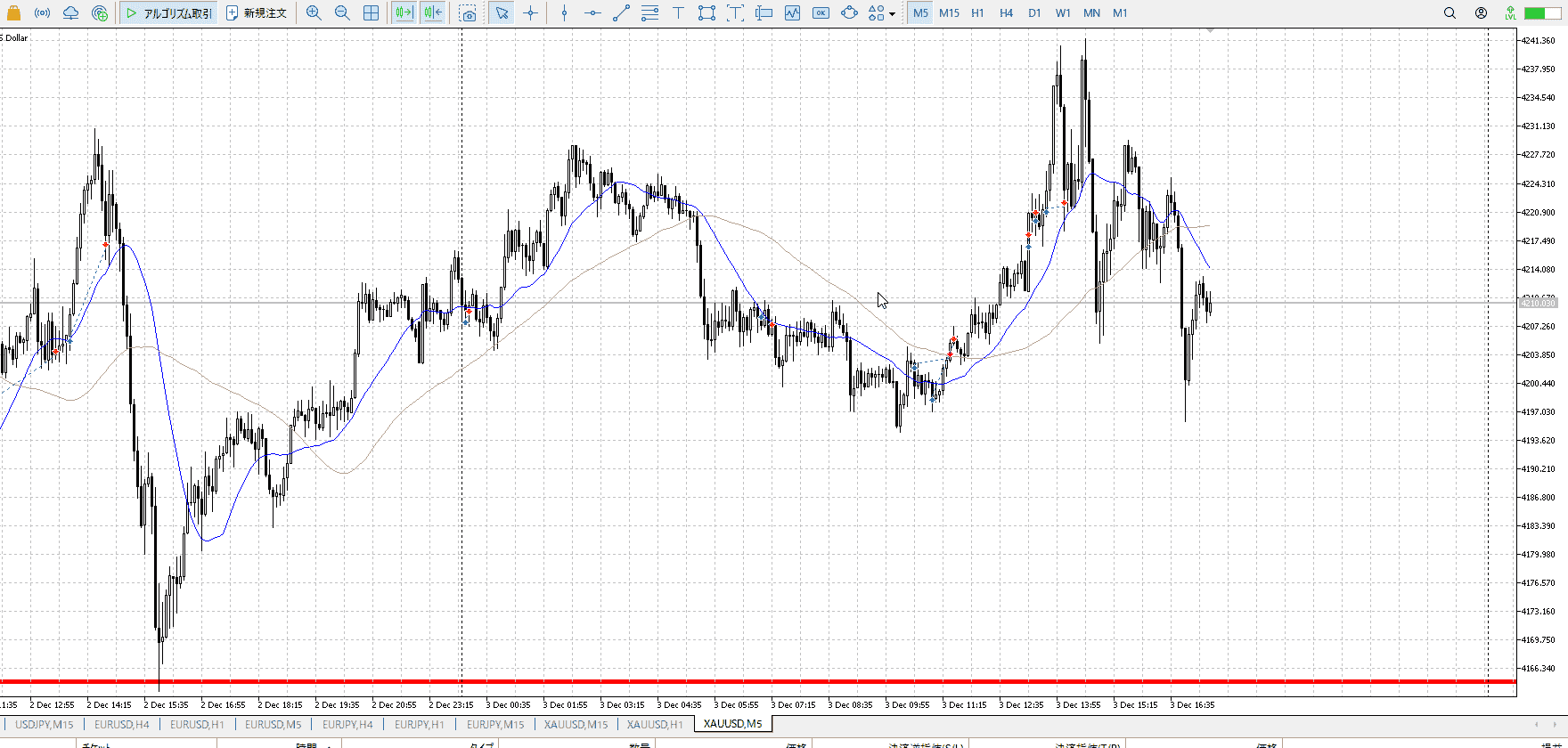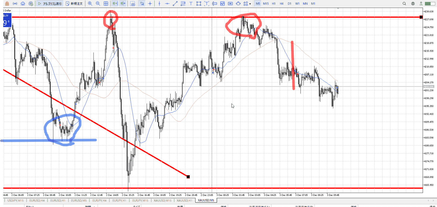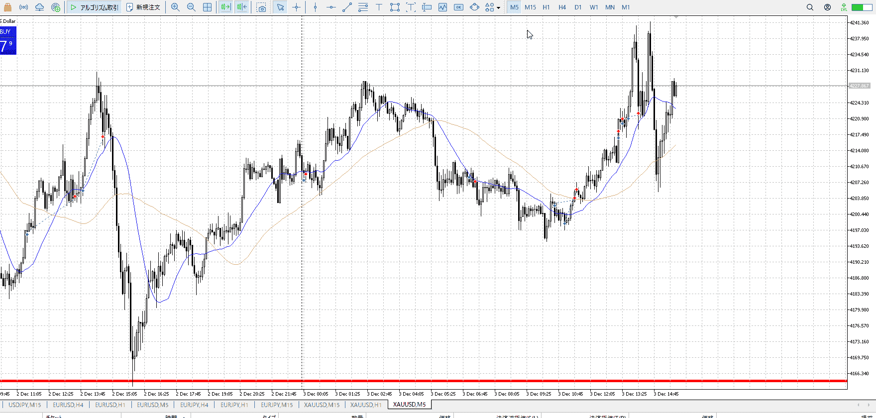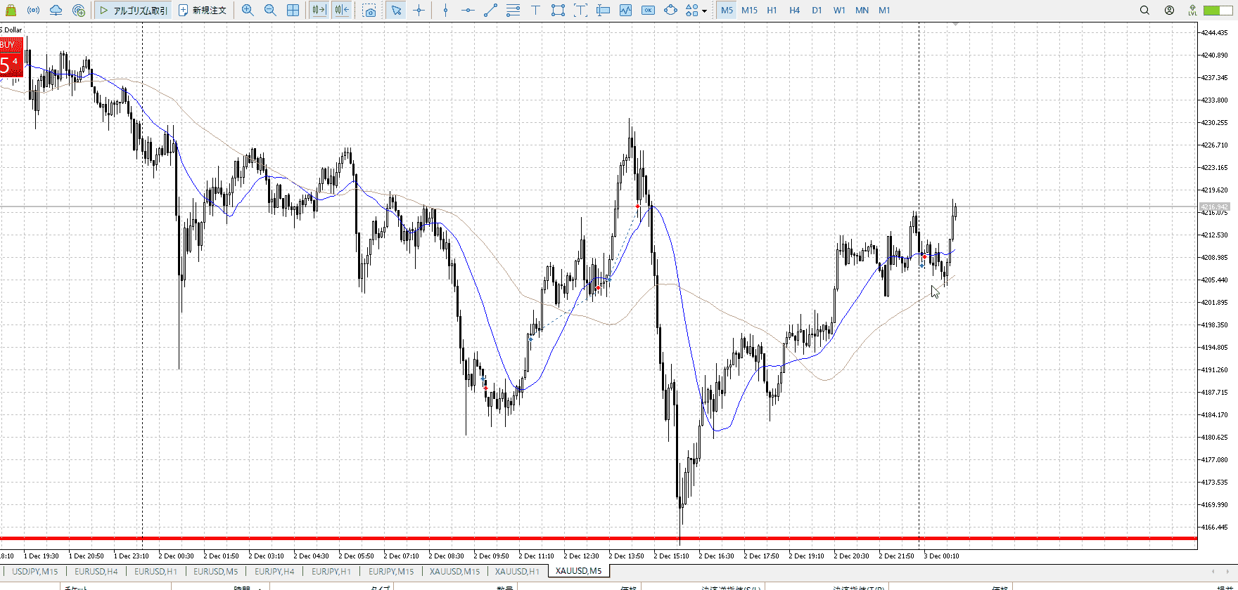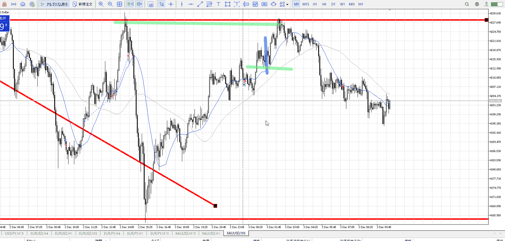 理想は02:00頃1h安値下髭、05:00頃の5mレンジで買いたかった。
