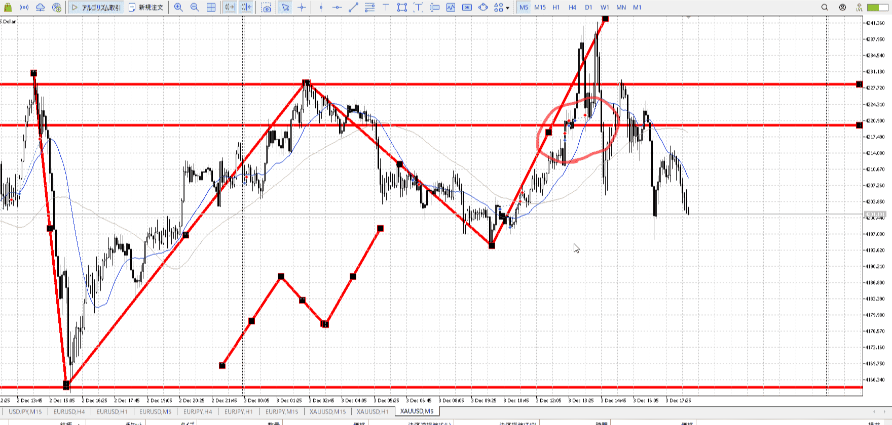 下降によりネックを割り、5mは下向きに。いったん上向きになる理由が欲しい。