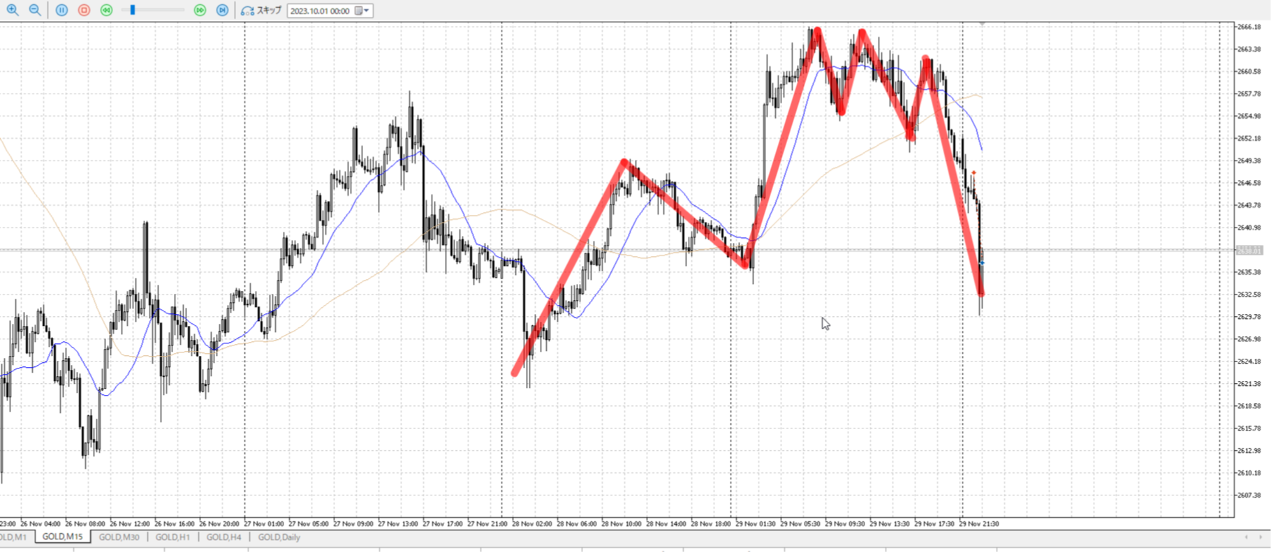 しかし15mで下へネックを割って落ちようとしている。全体としては買いたいのだがこれは15m安値までは一回落ちていくというところ。もしくはネック。